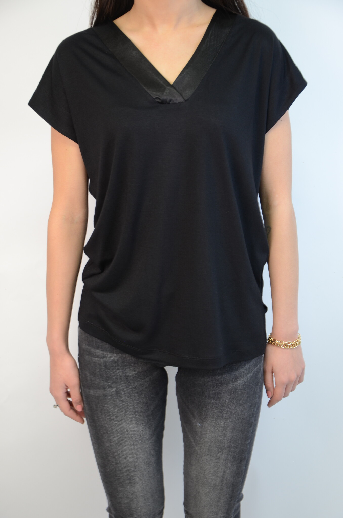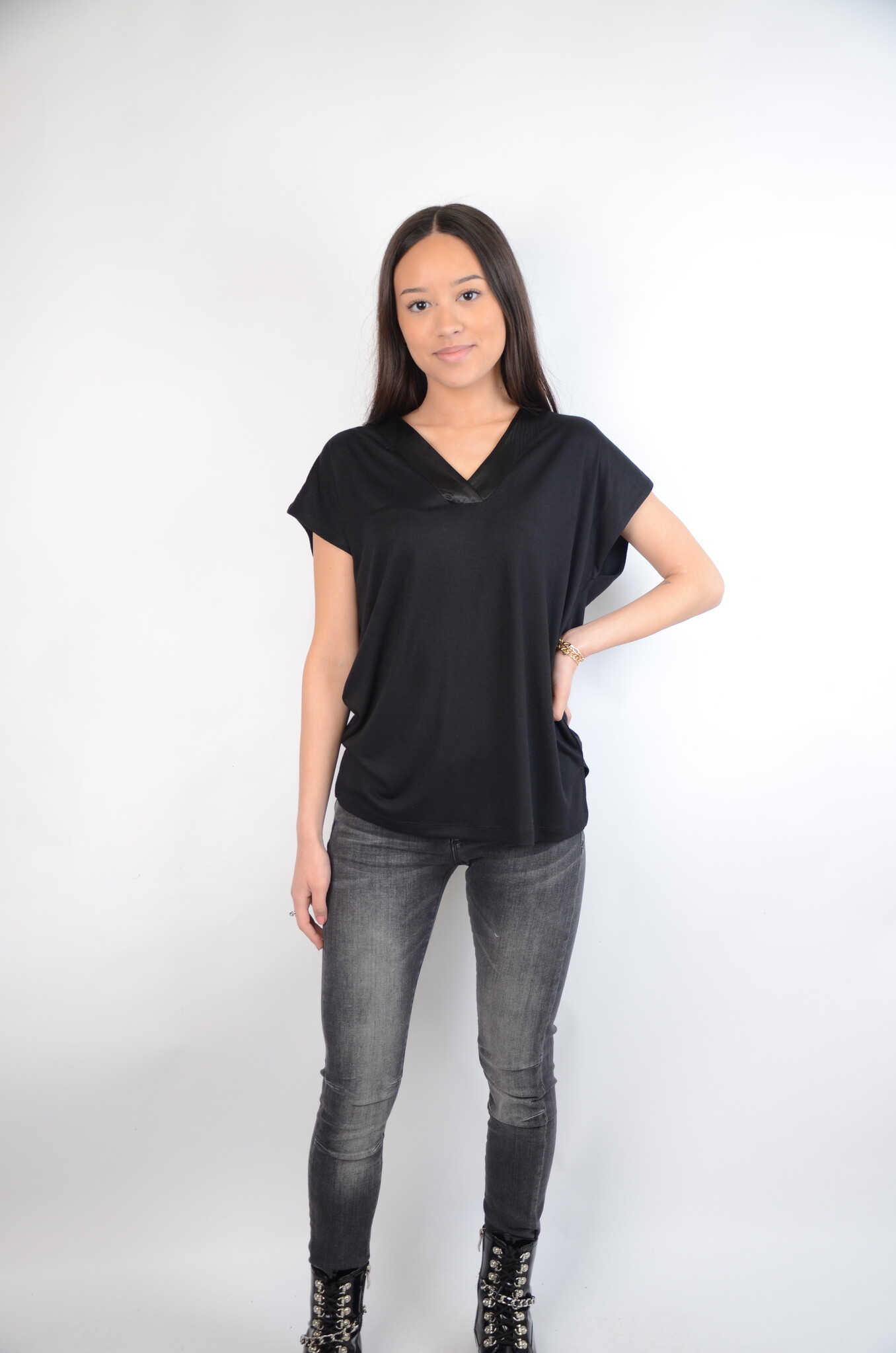 Dit zwarte T-shirt van het welbekende dames merk SoyaConcept is heeft een V-hals en sluit mooi lang het lichaam. Op de schouder zitten kleine ronde badges van plastic voor een leuke hype look. Deze top is makkelijk te combineren met een stoere jeans van bijvoorbeeld M.O.D die ook te vinden is in onze shop. Dit shirt is uitermate comfortabel door de modal mix in het shirt, lekker luchtig en bewegelijk kortom een echte aanrader.