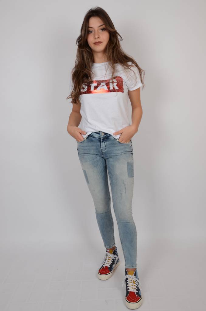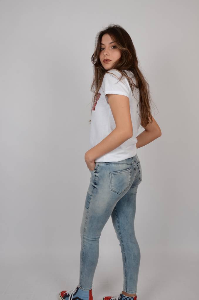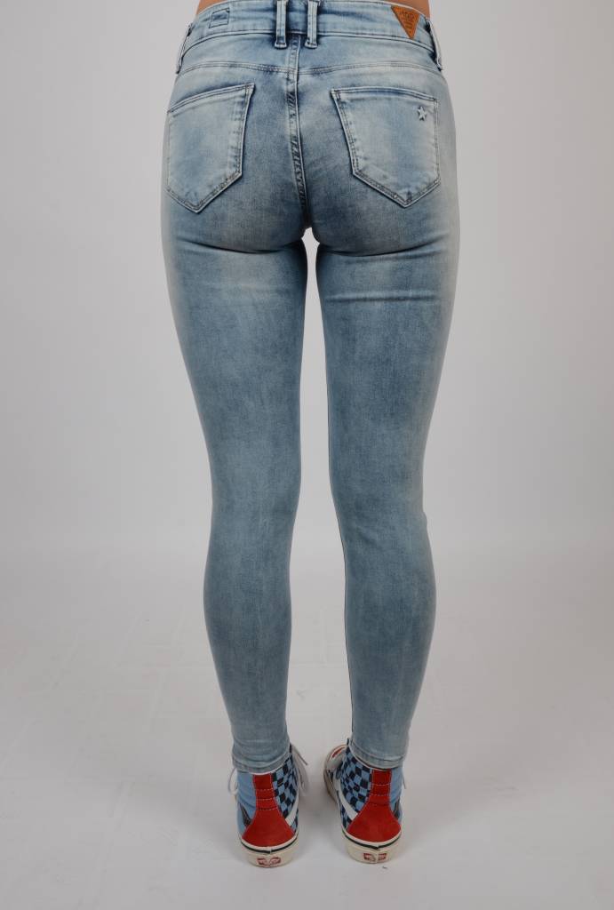 Leuke stoere dames jeans die makkelijk te combineren is met allerlei artikelen uit de webshop. Deze broek heeft 5 pockets 2 steekzakken 2 achterzakken en een money-pocket en sluit met een knoop en ritssluiting. De jeans heeft een licht blauwe wassing en is een echt skinny-fit model. De pasvorm van deze spijkerbroek is uitstekend.